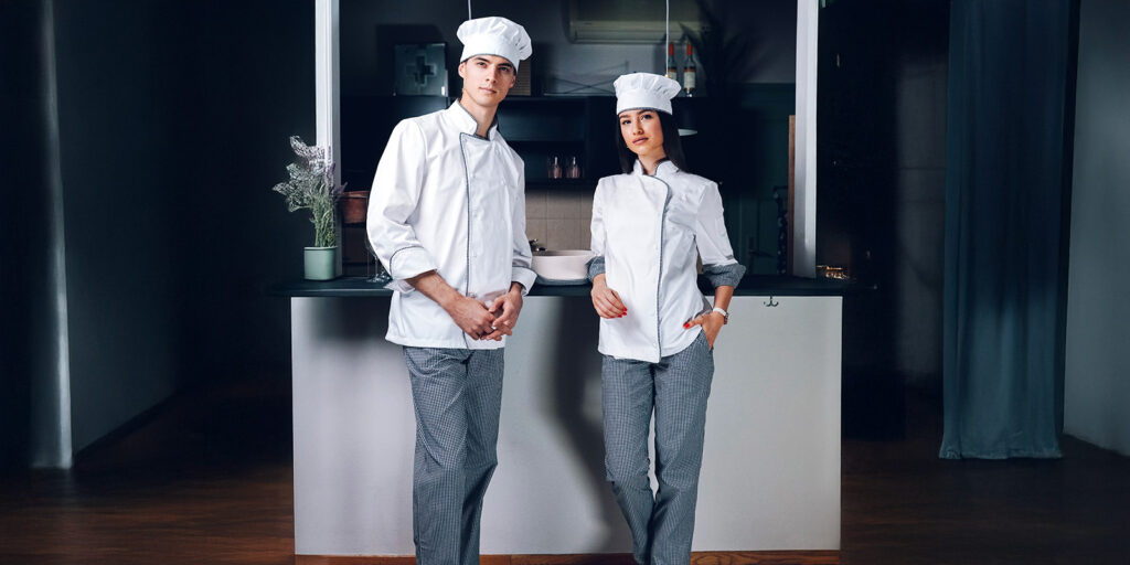 Uniforme za ugostiteljstvo podrazumevaju: – Kuvarski program (pantalone, bluze, kecelje, kape, rukavice) – Program za sobarice i konobare (pantalone, majice, kecelje, bluze)