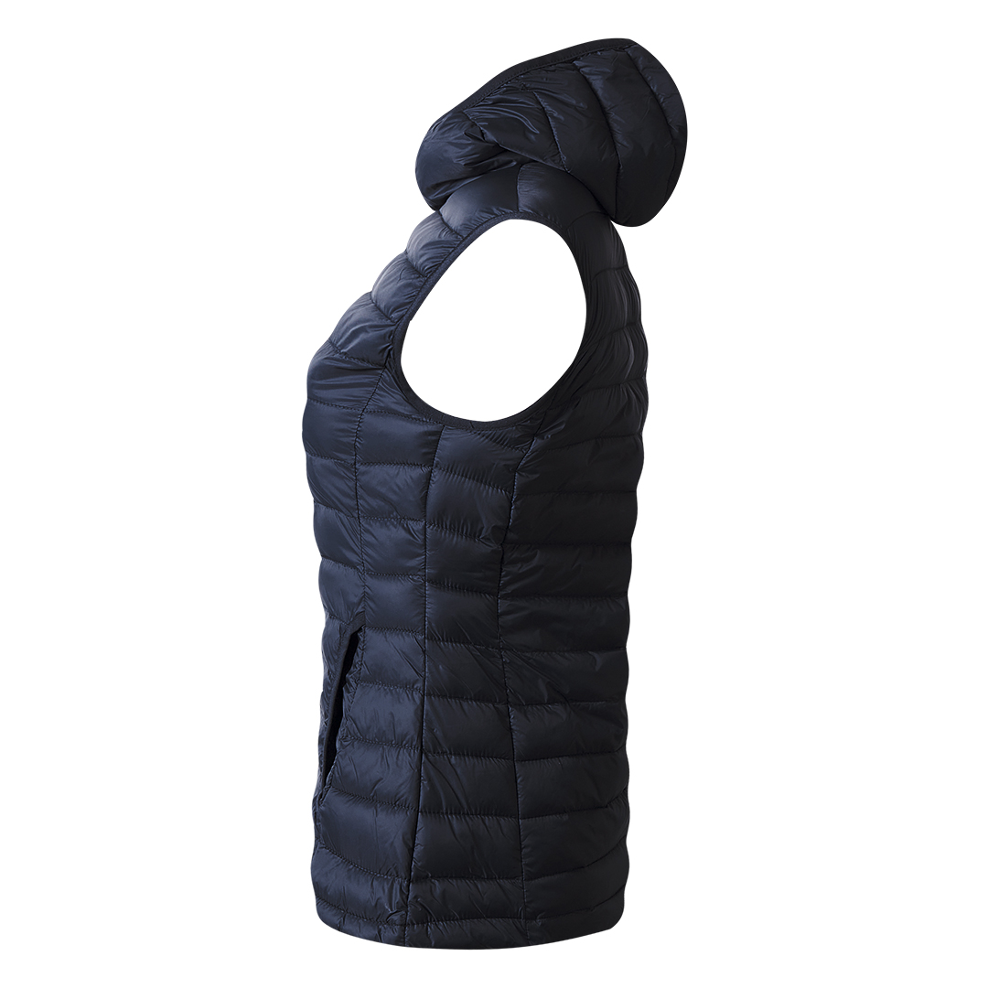 Ženski prsluk sa laganim punjenjem, blago strukiran, štepani, dva prednja džepa, elastični paspuli oko ramena, kapuljače i džepova