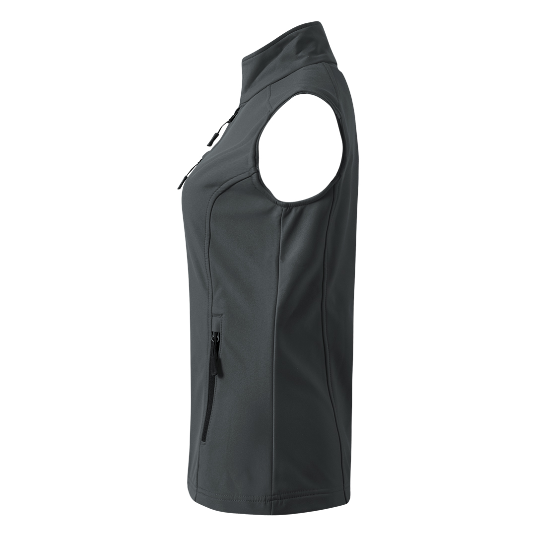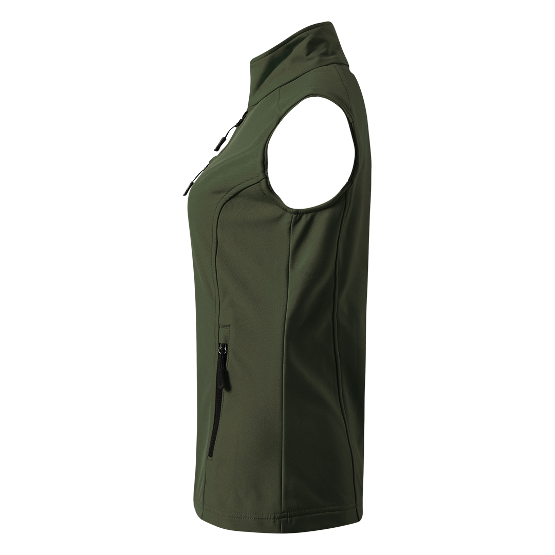 Ženski prsluk, blago strukiran, visoka kragna, dva prednja džepa sa rajsferšlusom i jedan na grudima